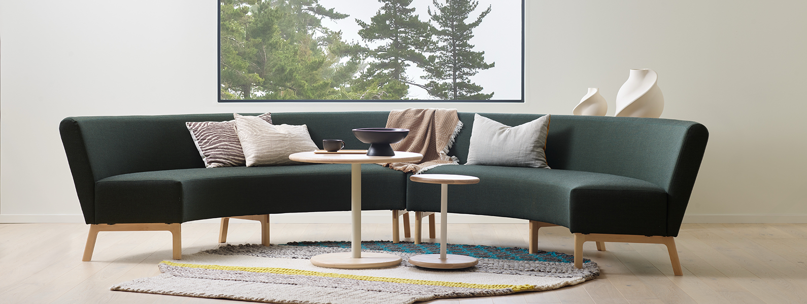 Soffserien är byggbar och kan anpassas efter olika miljöer och behov. Välj mellan raka eller rundade armstöd, samt ben i björk eller medstativ i metall.