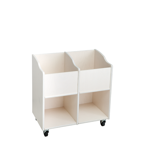 Bokvagn Didrik är en praktisk lösning för förvaring av böcker och andra material. Tillverkad av vitpigmenterad kryssfanér i björk. De kraftiga hjulen är låsbara, vilket ger stabilitet och säkerhet när bokvagnen är i användning.