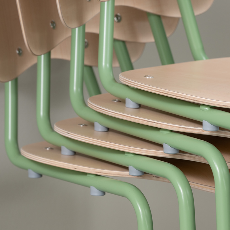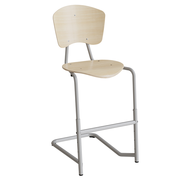 Ställbar stol Femman med sits och rygg i björkfanér eller laminat. Lackerat stålstativ med reglerbart fotstöd, filtgolvskydd för en bra ljudmiljö. Upphängningsbar.