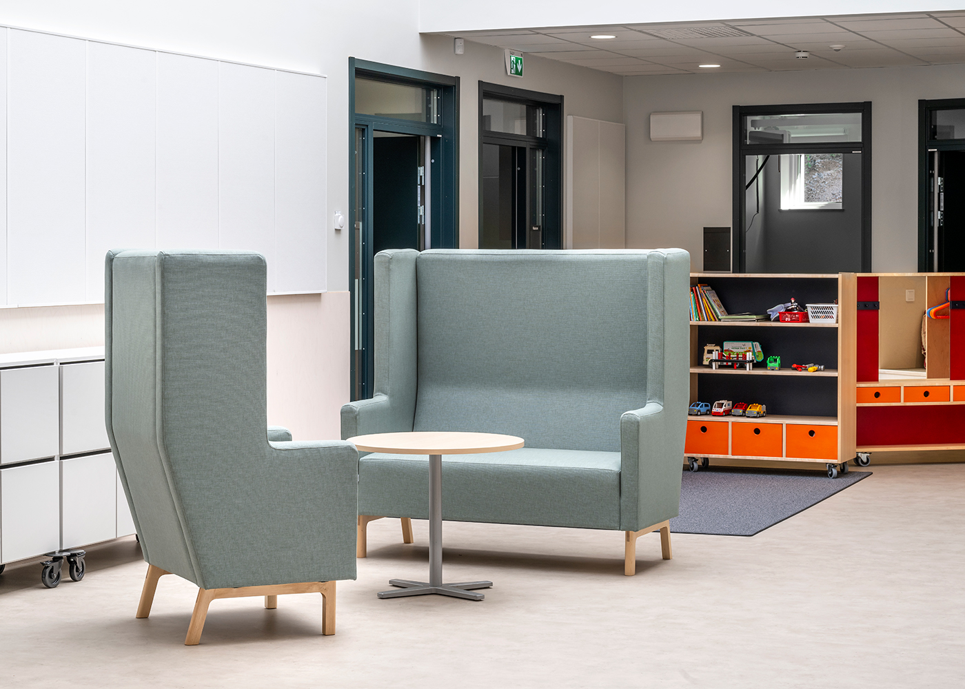 Mobil hylla Ida i björkfanér. Hyllan är utfällbar till dubbel bredd och innehåller hyllor, lådor, klädstång, knoppar och spegel. Hyllan är anpassad för barn i förskolan och kan användas som smink- och teaterloge eller som förvaring. Hyllan kan även användas som avskärmning.