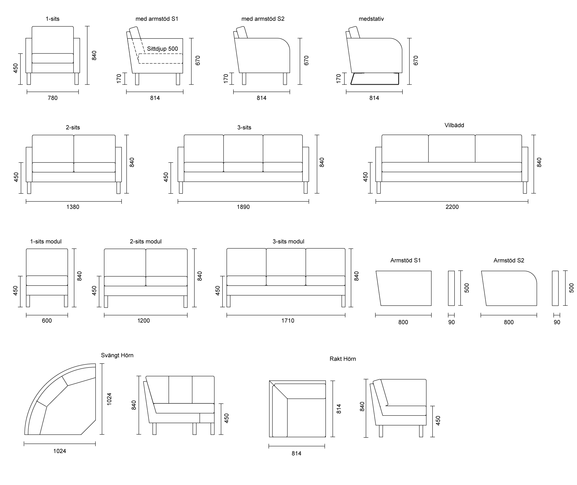 Soffserien är byggbar och kan anpassas efter olika miljöer och behov. Välj mellan raka eller rundade armstöd, samt ben i björk eller medstativ i metall.